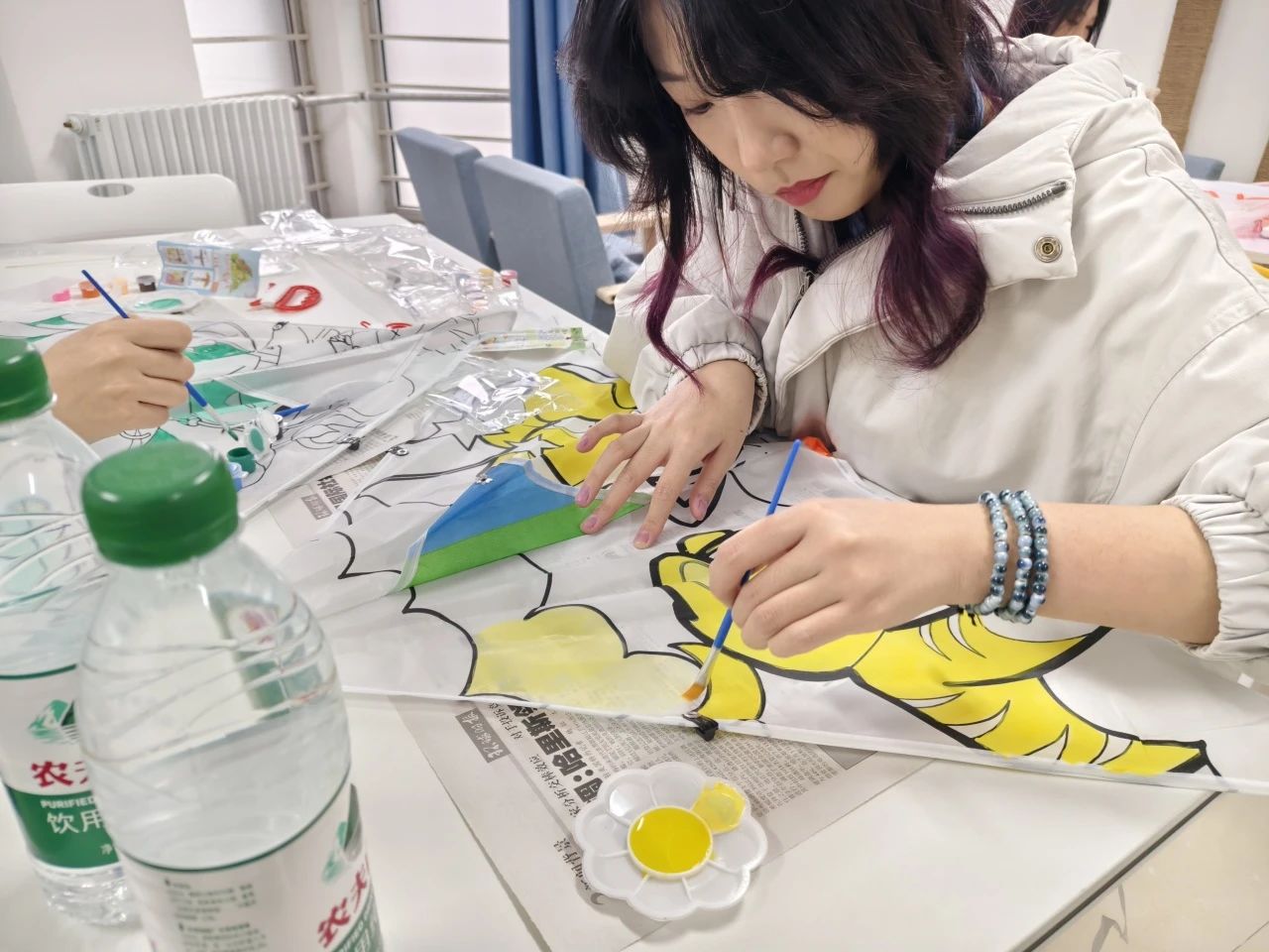 绘筝环节,空白风筝与涂鸦工具包分发至参与者手中。有人伏案专注,用橙红色调勾勒迷茫中的希冀;有人与邻座探讨笔触,笑声中晕开一抹明黄;还有人写下诗句,让风筝翅膀载满对未来的期许。活动室内,笔尖沙沙作响,焦虑随颜料流淌消散。