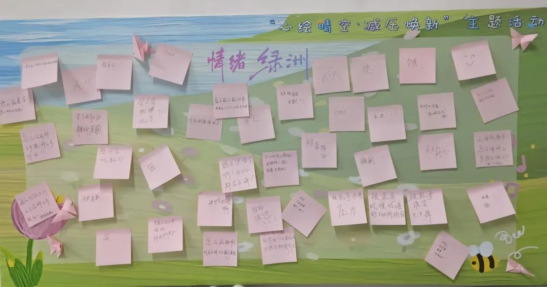活动伊始,一面名为“情绪绿洲”的解压展板成为焦点。同学们手持彩色便利贴,在纸上倾诉学业焦虑、坦陈人际困惑,将心事化作文字,轻轻粘贴于展板之上。展板逐渐被“烦恼树叶”填满,有学生感叹:“写下的瞬间,仿佛卸下了肩上的石头。”