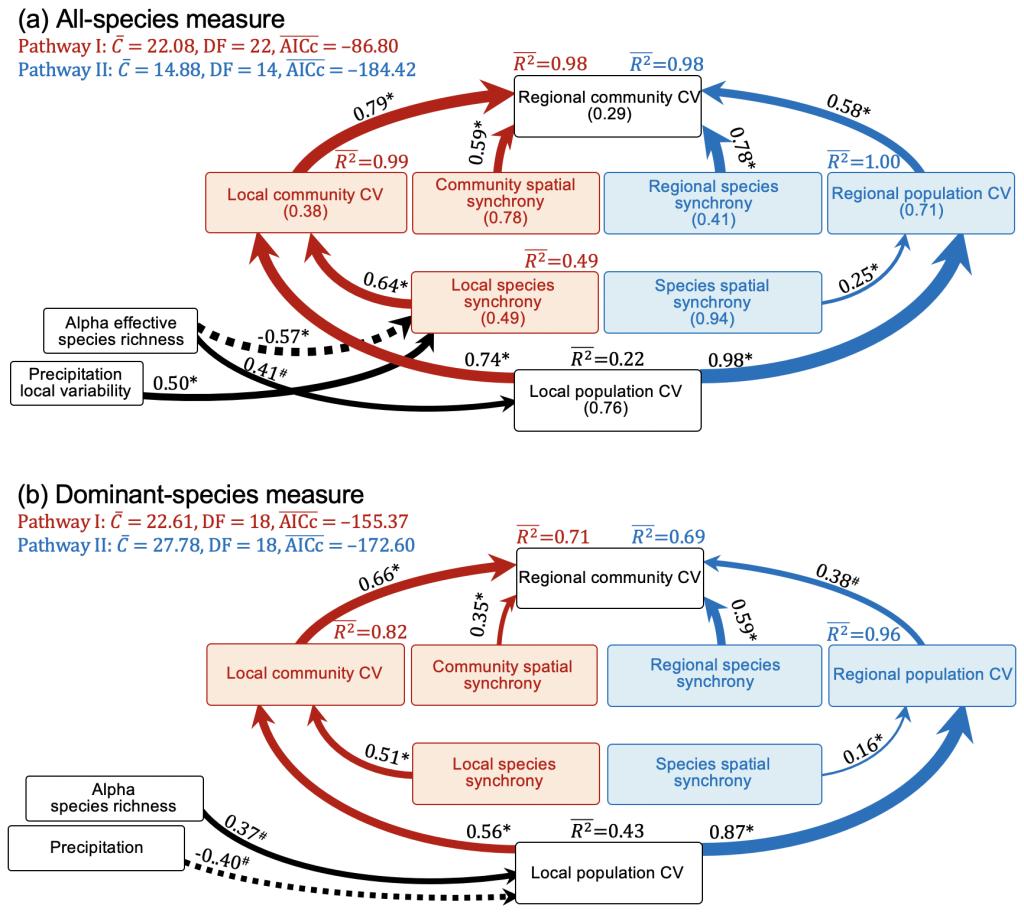 图4. 内蒙古温带草原区域集合群落生产力稳定性(衡量以其倒数变异性regional community CV)的维持机制。考虑了用所有物种(a)和仅用优势物种(b)估算不同尺度上的稳定性和异步性(衡量以其倒数即同步性synchrony)。