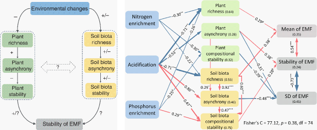 图1多胁迫下植物-土壤生物协同调控生态系统功能稳定性的概念模型(左图);结构方程模型解析氮磷酸化处理对多营养级属性及生态系统功能的影响路径(右图)。