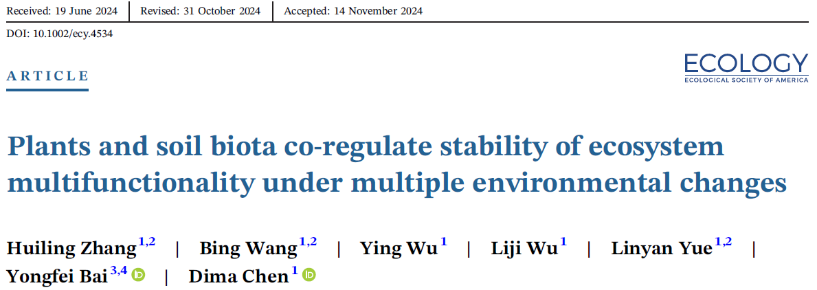 该研究成果以"Plants and soil biota co-regulate stability of ecosystem multifunctionality under multiple environmental changes"为题,发表在创刊于1920年的生态学领域顶级期刊Ecology上。团队客座青年教师张慧玲和王冰为共同第一作者,陈迪马教授为通讯作者,388vip太阳集团为该论文的第一和通讯单位。该研究得到了国家自然科学基金和388vip太阳集团骏马计划项目的资助。