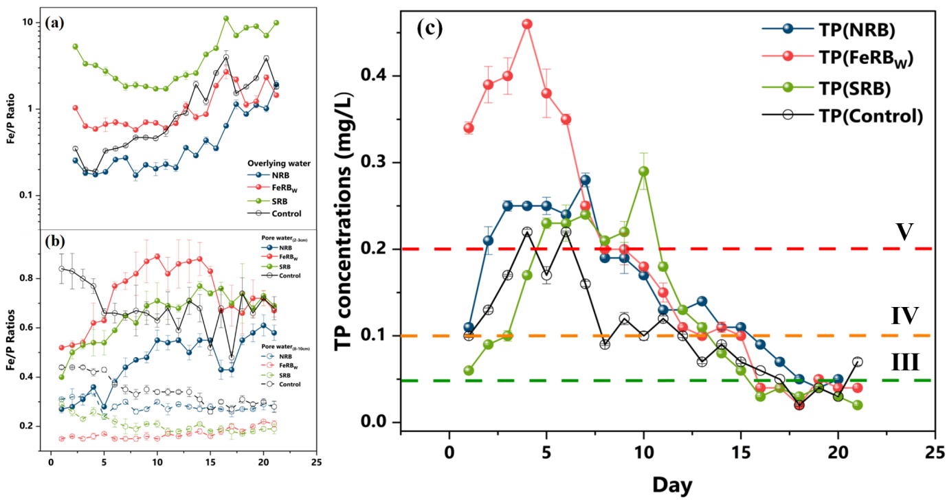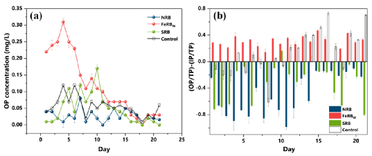 研究表明,冰封期微生物处理组上覆水中磷浓度仍高于对照组,特别是微生物活性较高的起始阶段强化了氧化铁还原和有机磷(OP)降解;无机磷和Fe2+在上覆水-孔隙水-沉积物体系中的相关性证实了水-沉积物界面通过孔隙水的桥接作用实质性地影响了上覆水的水化学特征,突出了内源污染对水质的影响。研究发现,硝酸盐还原菌优先降解有机质和有机磷而释磷,而异化铁还原菌主要还原溶解铁氧化物而释放铁结合态磷,揭示了不同微生物活性和环境条件下不同的磷释放机制和来源。本研究强调了微生物活动在冰冻期内源磷释放中的作用,特别是有机磷的释放,可能为春夏季藻华提供初始营养供应。研究确定了沉积物铁还原带(8-10 cm)为磷释放的热点层位,为精准确定湖泊最佳疏浚深度提供了关键科学依据。