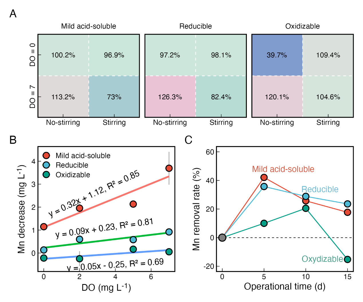 春夏季提高水位改善了溶解氧(DO)水平并降低了营养盐浓度(如硝酸盐),可显著降低总藻细胞密度;秋季水位升高虽可抑藻,但也加剧了锰释放风险。DO升高可显著减少沉积物中总锰的释放,主要是由于DO的增加促进了DOM由以类蛋白为主的C1组分向富含芳香族结构及反应性官能团的C2和C3组分转化,增强了DOM与Mn(II)之间的络合与吸附作用,促进了水体中溶解态锰向胶体态和颗粒态转化,从而有效降低了水体中Mn(II)的浓度。本研究基于Mn-DOM的结合机制,揭示了提升DO对减少底泥重悬过程中锰释放的重要意义,初步探索了基于锰氧化菌的生物去除技术,形成了沉积物重悬过程中Mn(II)去除机理的概念模式;结合现场实验结果,提出了两个关键风险阈值:17.4 μg/L(补偿阈值)和95.5 μg/L(风险阈值),为基于底泥重悬的藻类控制技术的实施提供了重要理论指导。
