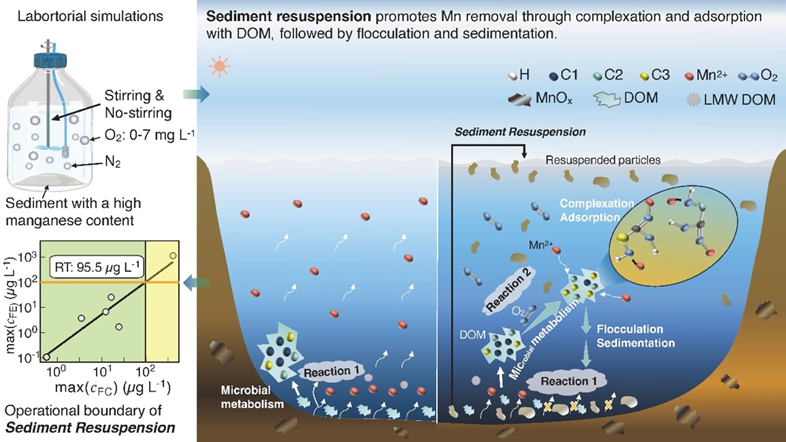 水源水库中底泥厌氧条件下释放还原态锰是供水系统重锰超标的重要发生源。通过底泥重悬提升沉积物氧化性可抑制锰释放,但同时给底泥带来的扰动也会增加锰的释放风险,相关机理尚不清楚。388vip太阳集团吕昌伟教授环境地球化学与健康创新组联合中国科学院生态环境研究中心杨敏研究员(国家杰青)团队,结合室内模拟与6个水源中的原位实践探究了底泥增氧与扰动下锰形态转化及去除机理,提出风险阈值,进一步明确了底泥重悬除藻降锰技术在水源中应用的边界条件,提升了供水系统中应对锰超标水质问题的防控应对能力。
