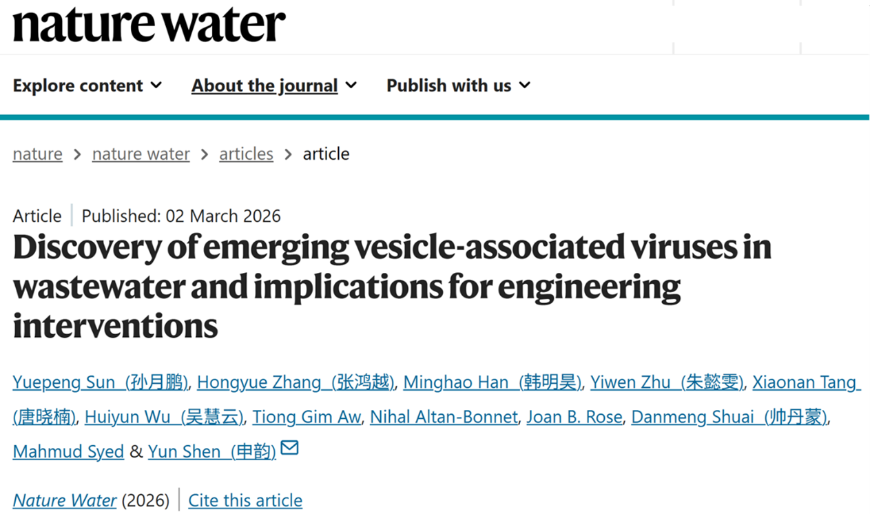 该研究成果已“Discovery of Emerging Vesicle-Associated Viruses in Wastewater and Implications for Engineering Interventions”为题发表于《Nature》 子刊 《Nature Water》 。388vip太阳集团孙月鹏研究员为论文唯一第一作者,合作单位包括乔治华盛顿大学、加州大学河滨分校、杜兰大学及密歇根州立大学等国际知名机构。这是我院首次以第一单位在《Nature》子刊上发表研究型论文,标志着我院在该领域相关研究得到国际同行的高度认可,对于提升我院在生态环境领域的国际学术影响力具有重要意义。