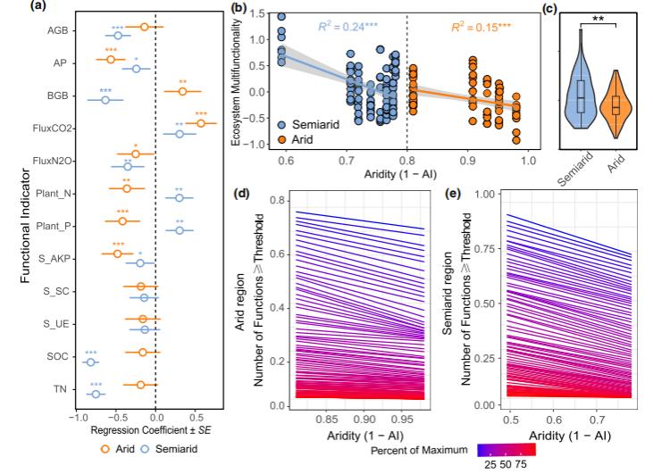 图 1 湖滨湿地功能指标与生态系统多功能性对气候干旱增强的响应。(a) 干旱区与半干旱区湖滨湿地各功能指标对气候干旱的响应。(b) 湖滨湿地生态系统多功能性(平均法)沿气候干旱梯度的变化。(c) 干旱区与半干旱区生态系统多功能性的差异。(d,e) 干旱区与半干旱区分别在多阈值下沿气候干旱梯度的生态系统多功能性变化。
