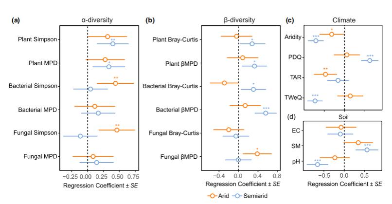 在干旱区,植物多样性对干旱度没有显著响应。相反,在半干旱区,植物的物种多样性与系统发育多样性在α和β两个尺度上均随干旱增强而显著下降。微生物多样性对干旱的响应不一致。在干旱区,细菌和真菌多样性总体随干旱增强而升高:分类多样性(Simpson)与系统发育多样性(MPD)的α多样性均显著上升;而β多样性(Bray–Curtis、βMPD)对干旱无显著响应。然而在半干旱区,仅真菌 Simpson 多样性随干旱加剧而增加,而细菌与真菌的MPD均随干旱加剧显著下降。在区域尺度上,半干旱区细菌的Bray–Curtis与βMPD均随干旱加剧而降低(图2)。