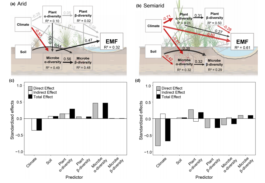 图 5 湖滨湿地生态系统多功能性(EMF)的直接与间接驱动因素。(a) 干旱区。(b) 半干旱区。(c, d) 分别为干旱区与半干旱区中,气候、土壤、植物与微生物 α 与 β 多样性对 EMF 的标准化直接、间接与总效应。