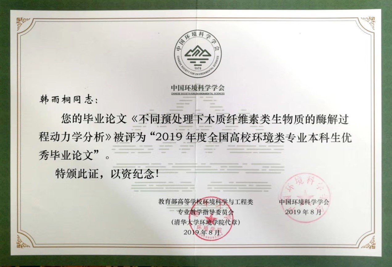 2019年度全国高校环境类专业本科生优秀毕业论文评选结果揭晓,经过教育部高等学校环境科学与工程类专业教学指导委员会和中国环境科学学会专家评审,我院许继飞副教授指导的毕业论文,由2015级本科生韩雨桐撰写的《不同预处理下木质纤维素类生物质的酶解过程动力学分析》获“2019年度全国高校环境类专业本科生优秀毕业论文”称号。