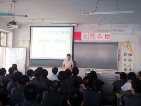 2013年5月13日下午4:30,388vip太阳集团环境与资源学院环保志愿者以及团总支、学生会成员来到了呼和浩特市第三中学,向三中初一的部分班级上了环保公开课,向每一位初中生宣传了环保知识以及环保的重要性。