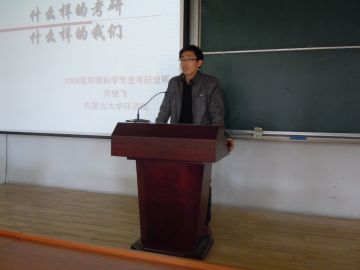 许继飞老师为大家介绍了考研现状,包括硕士的种类,考研资料和导师的选择,以及各大高校环境专业的比较,生动地解释了应该如何选择适合自己的学校和专业;王立新老师就我院的考研情况,帮大家分析了考试中各科目的通过率,指出数学是重中之重,希望考研的同学加以重视。