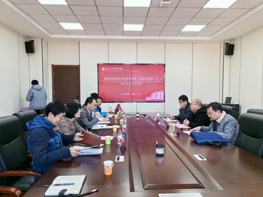 11月18日下午,河北大学党委常委、副校长张锋一行来我院调研交流。河北大学发展规划处处长宋少俊、生命科学学院院长柳峰松陪同调研。会议由学院党委副书记、执行院长王立新主持。