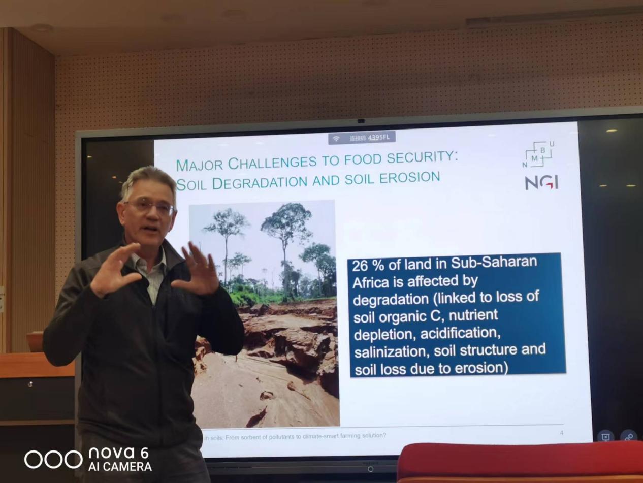 Jan Mulder教授为清华大学客座教授,多年来一直从事陆地生态系统碳、氮和微量元素的生物地球化学循环过程的研究,目前主要关注全球变化背景下温室气体排放、多种元素的生物地球化学循环和生物碳对改善农业土壤质量的影响等,发表论文170余篇,H-index达 57。学术报告中,Jan Mulder教授介绍了生物炭(Biochar)在改善土壤结构、增加土壤肥力、提高农作物产量等方面的功效,深入讲解了其在非洲和南亚多国农业领域的应用。